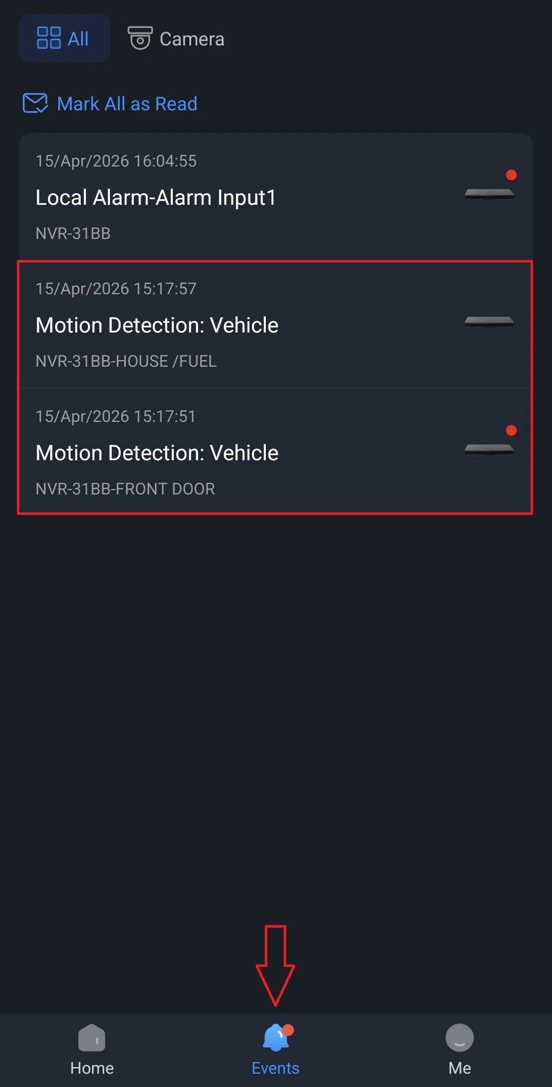 9.) Alerts will appear under the Events tab. Tap on the alert to watch a short playback.